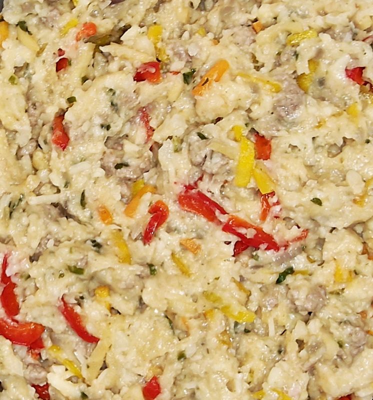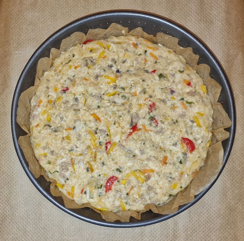 Den zerkleinerten Blumenkohl und etwas von den kleinen Röschen (Rest ist zum Belegen); die Hackfleischmischung und die Karotten Paprikamischung miteinander vermischen. Pizzateigmischung, geriebenen Käse (davon etwas zum bestreuen zur Seite legen) und Gewürze hinzufügen, mit dem lauwarmen Wasser aufgießen und gut durchrühren. Abschmecken ob gewürzt so passt, ansonsten nachwürzen. Soll ein weicherer Teig sein - wenn er zu fest ist, noch etwas Wasser hinzufügen. Die Masse 15 Minuten rasten lassen.