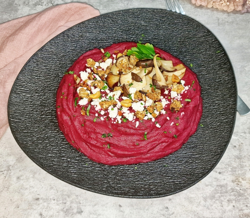 Für das Topping Kräuterseitlinge in Scheiben schneiden, in Butterschmalz gewürzt mit Gemüseliebling anbraten. Püree warm mit Pilzen, etwas Fetakäse, und Spicey Speck Müsli servieren.