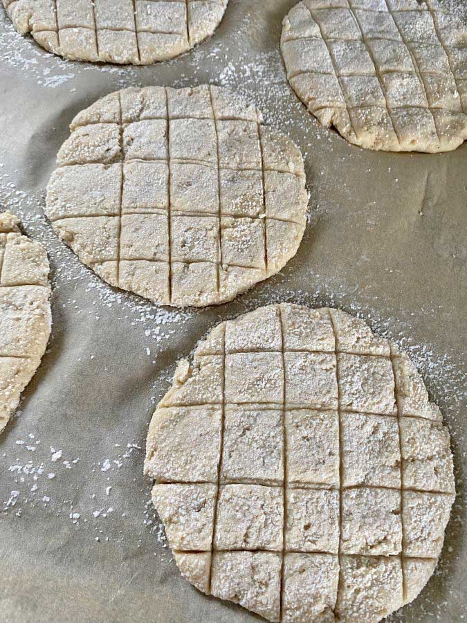 Mit einer Teigkarte vorsichtig ein Raster in die Fladen drücken.