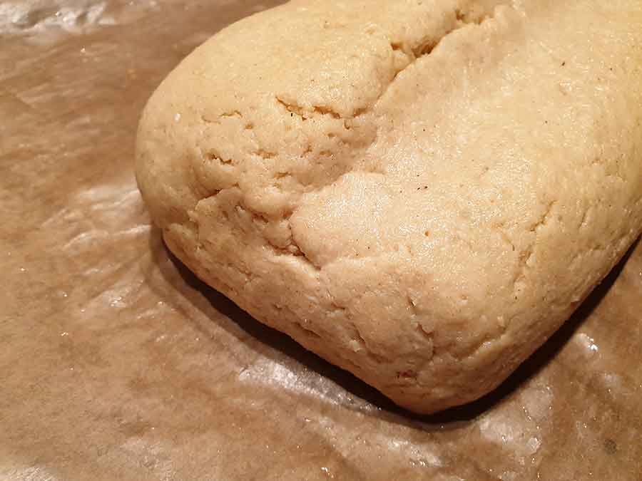 Mit feuchten Händen auf einem Stück Backpapier auf die gewünschte Größe ausrollen (s. Bilder unten).