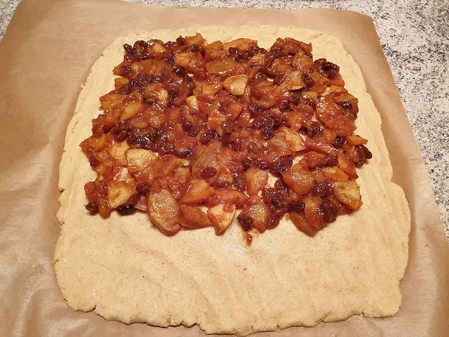 Die Apfelmasse auf dem Teig verteilen, dabei an den Rändern ca. 2-3 cm und an einer langen Seite ca. 5 cm Platz lassen (die Füllung schiebt sich etwas vor).