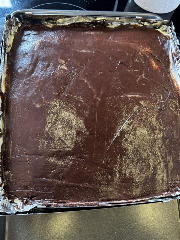 Die Ganache auf der Creme verteilen und glatt streichen.