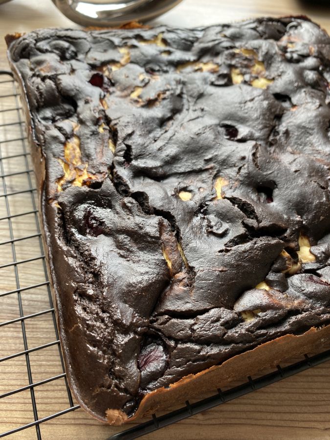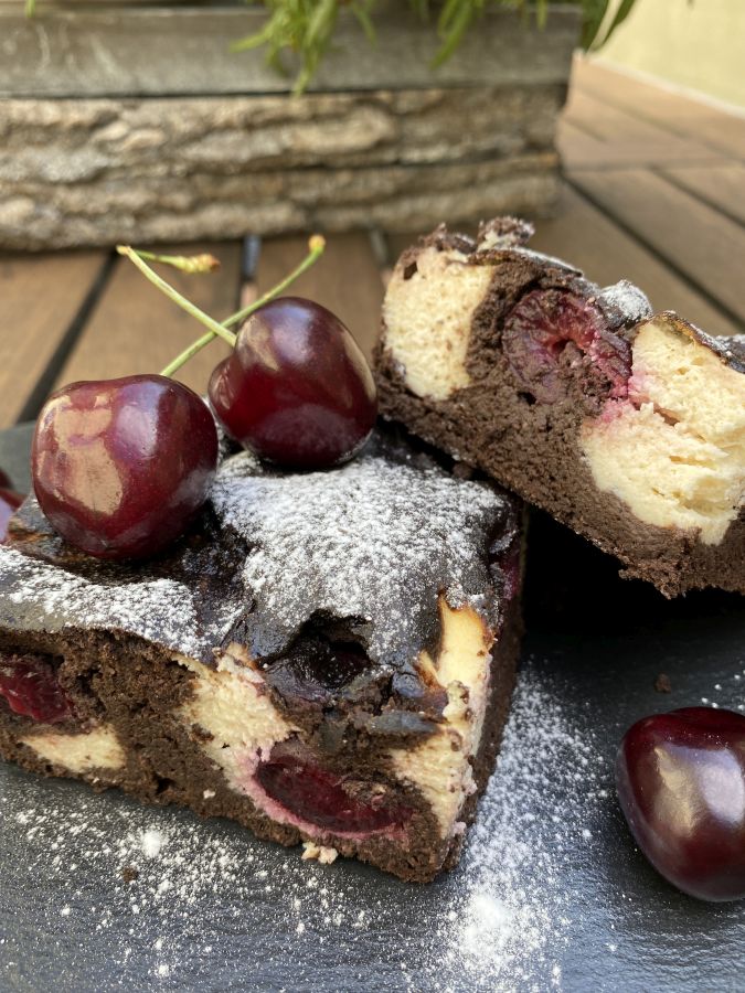 Die Browniemasse in die Form kippen, danach mit einem Esslöffel die Käsemasse in Klecksen reinsetzen. Die Kirschen auf der Masse verteilen und leicht reindrücken.