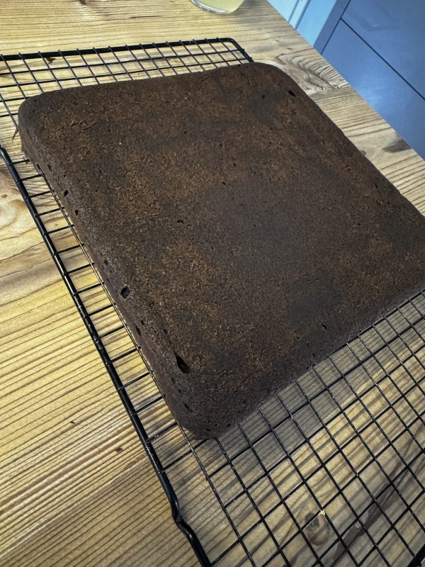 Teigplatte kurz etwas auskühlen lassen (10 Min) und dann zum vollständigen Erkalten auf ein Gitter geben.