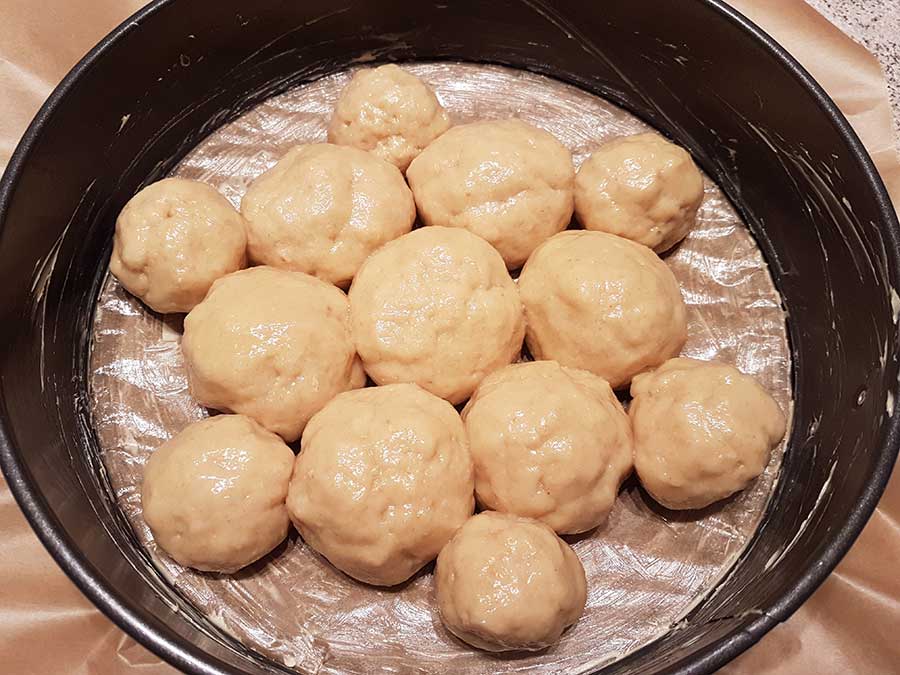 Eine Springform oder andere ofenfeste Form gut buttern oder mit Backpapier auslegen (und das Backpapier buttern!). Den Teig zu mehreren Knödeln formen und locker nebeneinander in die Form setzen. Die Buchteln werden beim Backen zusammenwachsen, das ist aber genau gewollt und sieht auch hübsch aus.