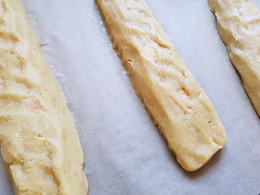 Den Teig zu 3 Rollen formen (ca. 3-4 cm breit und 2 cm hoch) und auf ein mit Backpapier ausgelegtes Backblech legen.