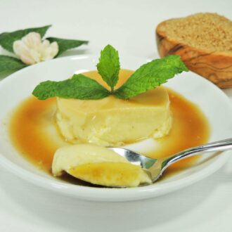 Die Karamellsauce in feuerfeste Schälchen auf max. 1 cm Höhe befüllen. Dann eine Fettpfanne mit Wasser füllen (worin später die Schälchen zu zwei Drittel bedeckt stehen sollten). Backofen auf 150 °C auf Ober- und Unterhitze vorheizen.