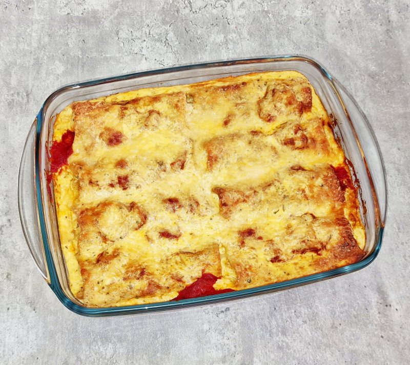 Eine Auflaufform ca. 39 x 24 cm vorbereiten und mit 2/3 der Tomatensauce den Boden bedecken.