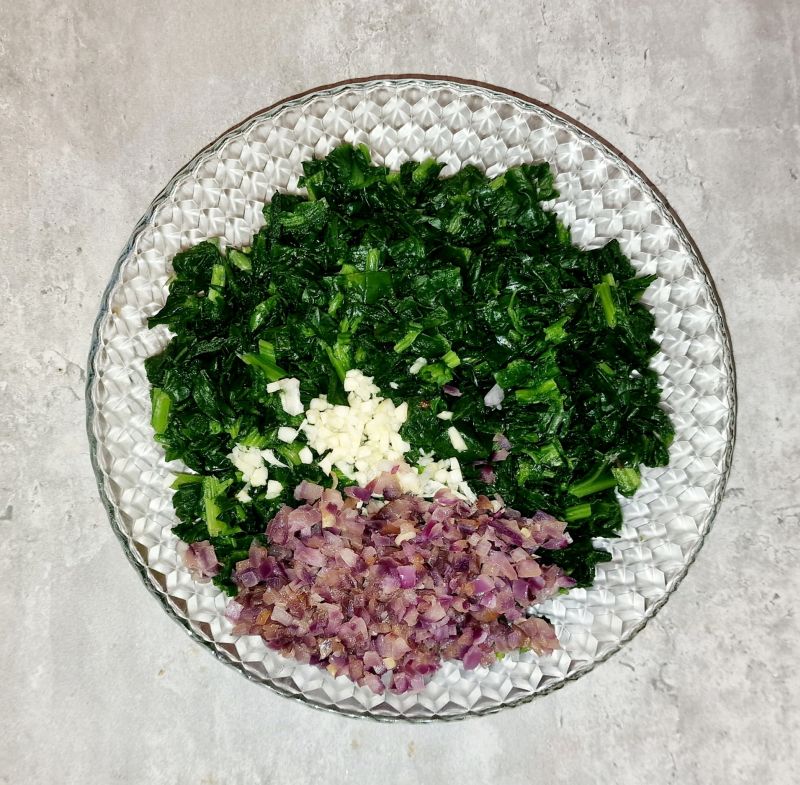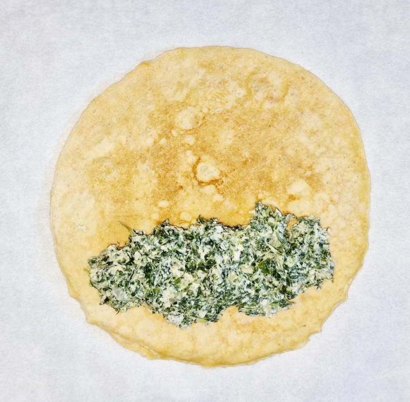 Für die Fülle Zwiebel in kleine Stücke schneiden und in geschmolzenem Butterschmalz und Karamelltraum leicht anbraten. Spinat aufgetaut klein schneiden. Knoblauch in kleine Stücke schneiden oder pressen. Spinat und Knoblauch zum Zwiebel, Salz und Gemüseliebling in die Pfanne hinzufügen und anbraten bis die Flüssigkeit vom Spinat verdunstet ist. Etwas abkühlen lassen, dann Ricotta, Parmesan hinzufügen und miteinander vermengen. Abschmecken und zur Seite stellen.