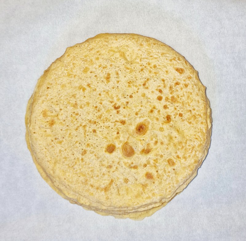 Für die Crêpes Wasser, Milch, Ei, Prise Salz verquirlen, Backmischung und Bambusfaser hinzufügen und einen Teig zubereiten. Ich verwende Bambusfaser, weil die Crêpes heller bleiben. Man kann aber auch das Rezept von der Teig-Packung verwenden. In einer Pfanne (24cm) 8 Stück Crêpes ausbacken und zur Seite stellen.