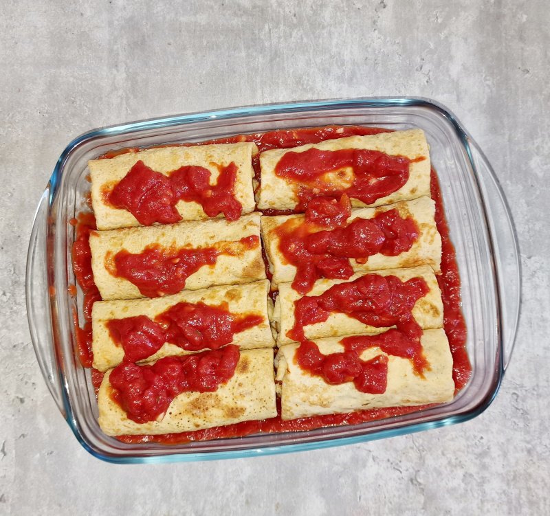Die Crêpes füllen. Dafür am unterem Rand die Fülle aufsetzen, den Crêpes hochklappen und seitlich einschlagen und aufrollen. Den gefüllten Crêpes auf die Tomatensauce setzen. Mit den restlichen Crêpes wiederholen und nebeneinander in die Backform legen. Das restliche Drittel der Tomatensauce auf den Crêpes verteilen.