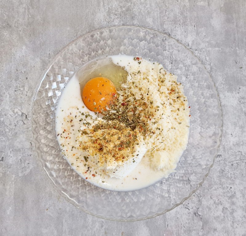 Für den Guss, Ricotta, Ei, Milch, Salz, Gewürze und Parmesan in eine Schüssel füllen und gut durchrühren. Über die Crêpes giessen und mit dem restlichen Parmesan bestreuen.