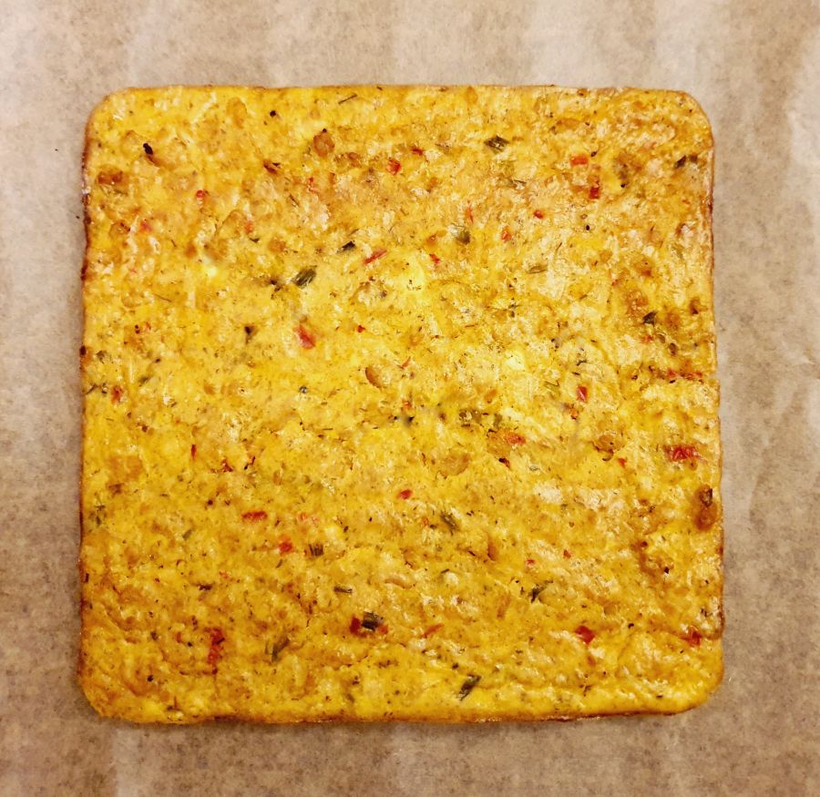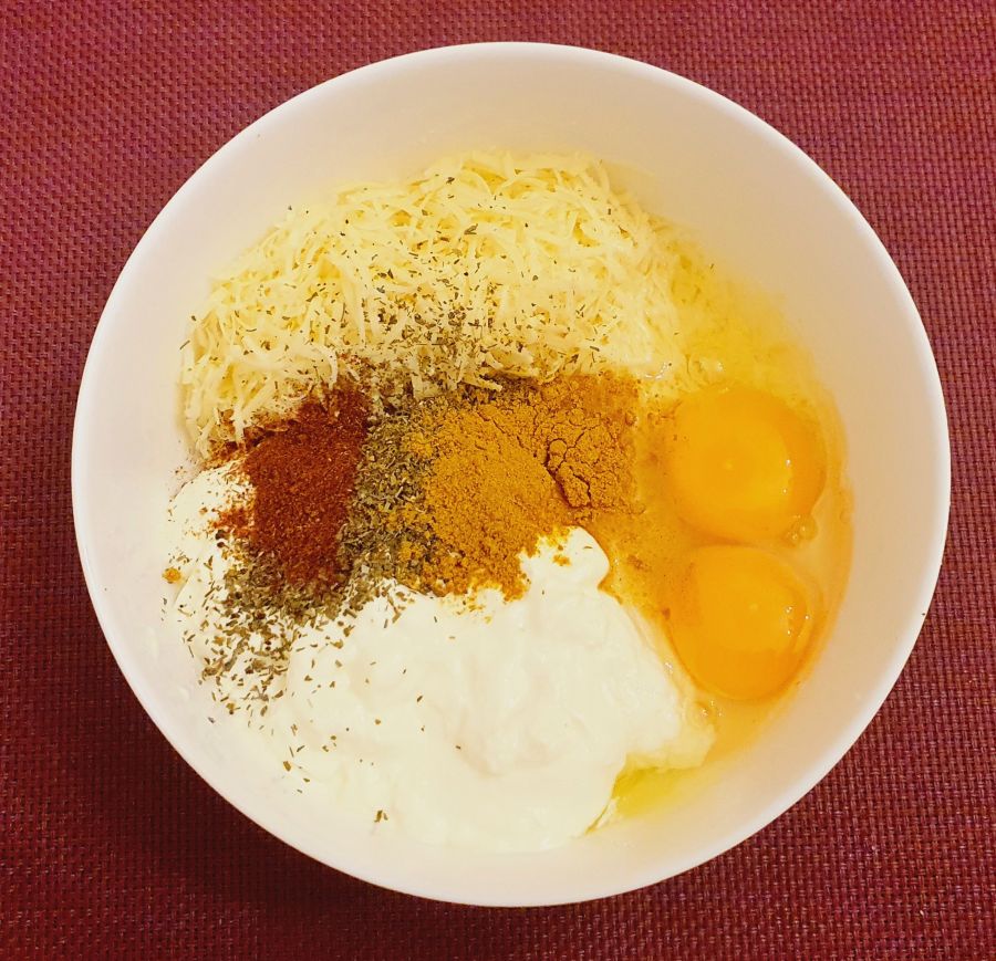 Für den Guss Frischkäse, Eier, Zitrusfaser und Milch glattrühren, geriebenen Käse und Gewürze unterheben und nach Geschmack würzen. Nach Belieben nachwürzen.