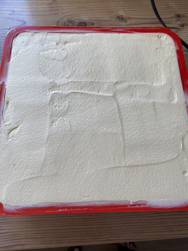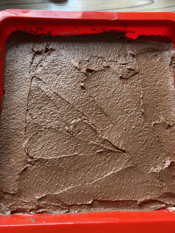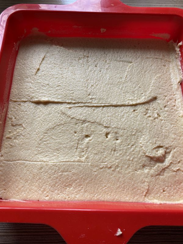 Die Hälfte des Teiges in die Silikonform geben und verstreichen. Hat man keine Silikonform, kann auch ein Backrahmen oder andere Form verwendet werden.
