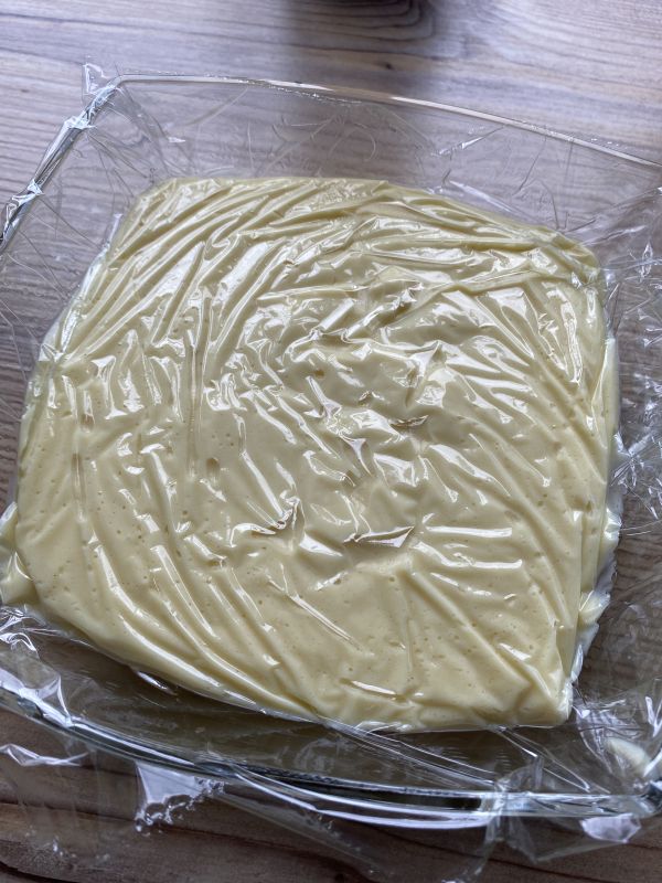 In eine Schüssel umfüllen und direkt auf die Oberfläche Klarsichtfolie legen, so entsteht keine feste Schicht auf der Oberseite des Puddings.