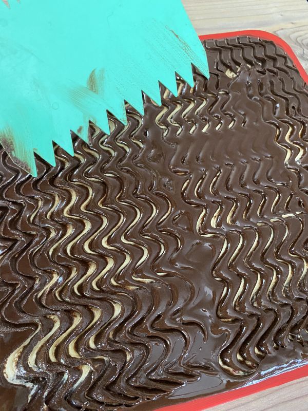 Nun mit dem Kuchengarnierer (Tortenkamm) ein Wellenmuster in die Schokolade zeichnen.