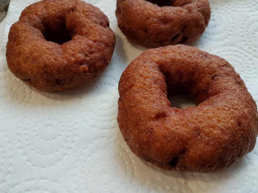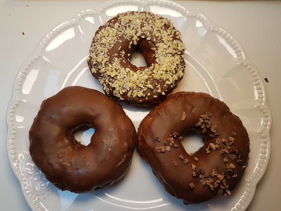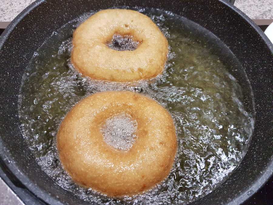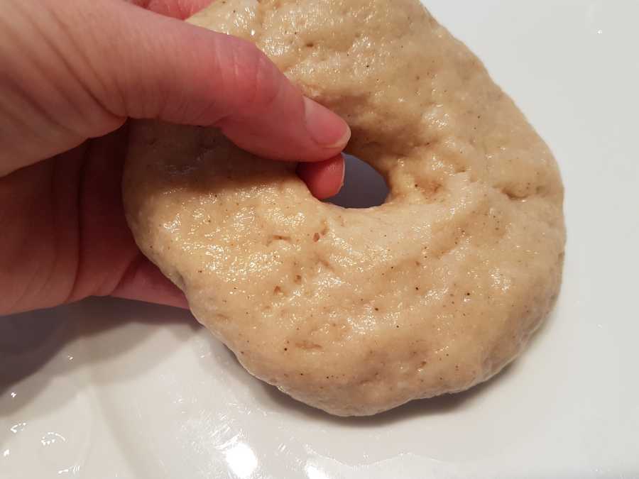Packungsanleitung der Mini-Berliner mit Hefe zubereiten. Aus dem Teig 4 - 6 Donuts formen. Das geht besonders einfach, wenn du zunächst die Teigklumpen zu Knödeln formst, diese etwas platt drückst und mit dem Finger ein Loch in die Mitte stichst. Anschließend weitest du das Loch gleichmäßig rundherum aus (s. Photo). Die Teiglinge anschließend 45 Minuten offen ruhen lassen.