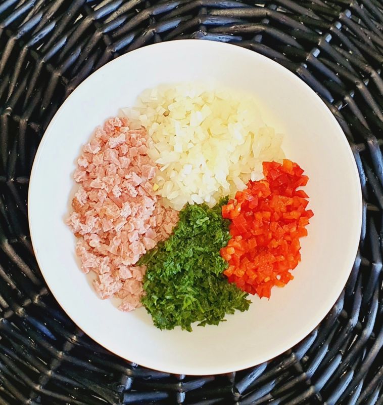 Zwiebel, Schinken, Paprika und Petersilie sehr klein schneiden.