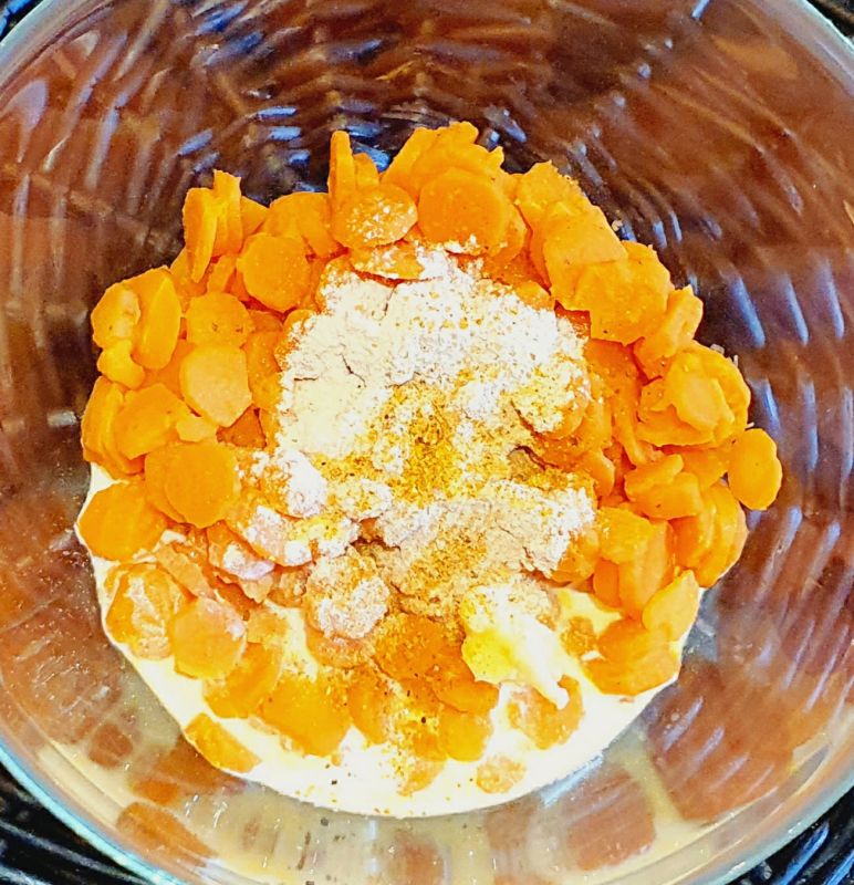 In der Zwischenzeit Karotten schälen und klein schneiden. Weich kochen und etwas abkühlen lassen. Sahne hinzufügen, Zitrusfaser und Gewürze und mit einem Stabmixer pürieren.