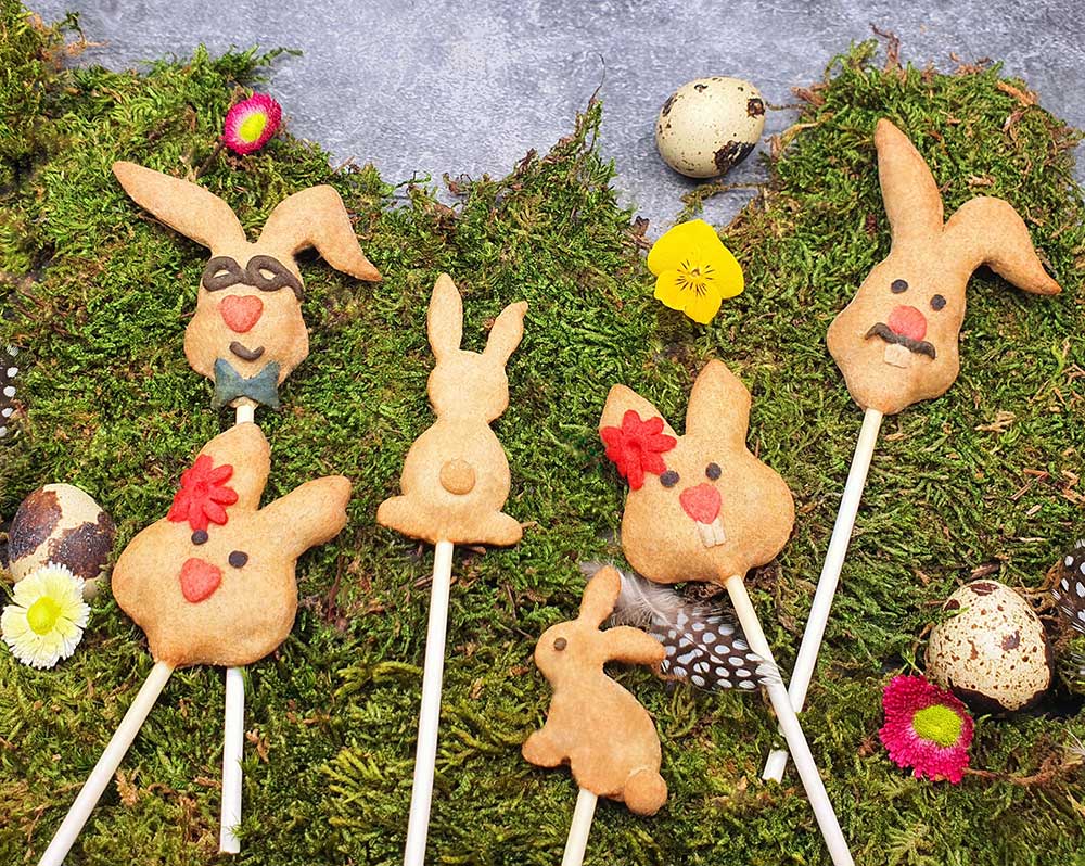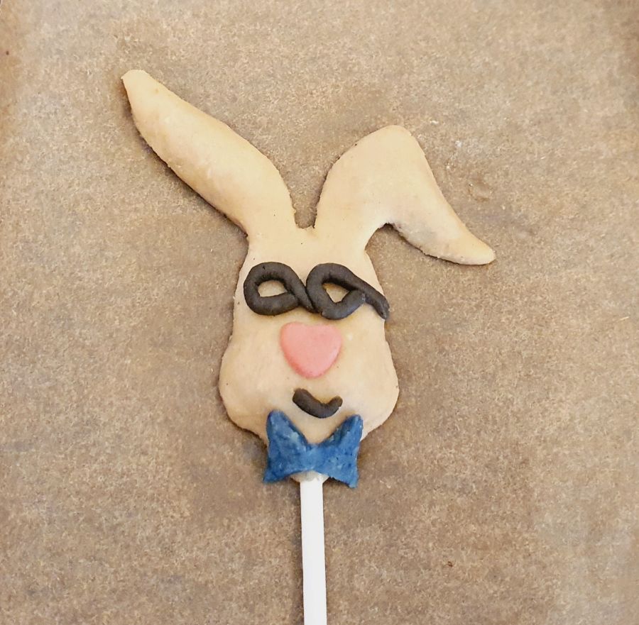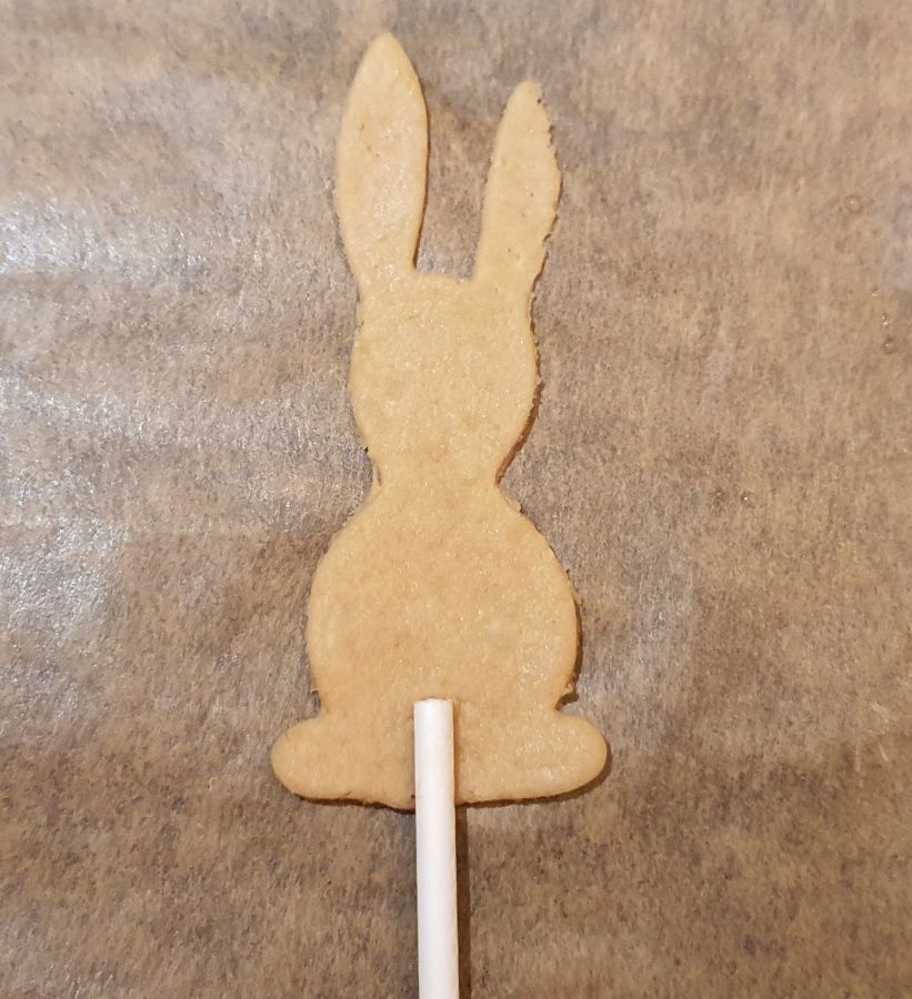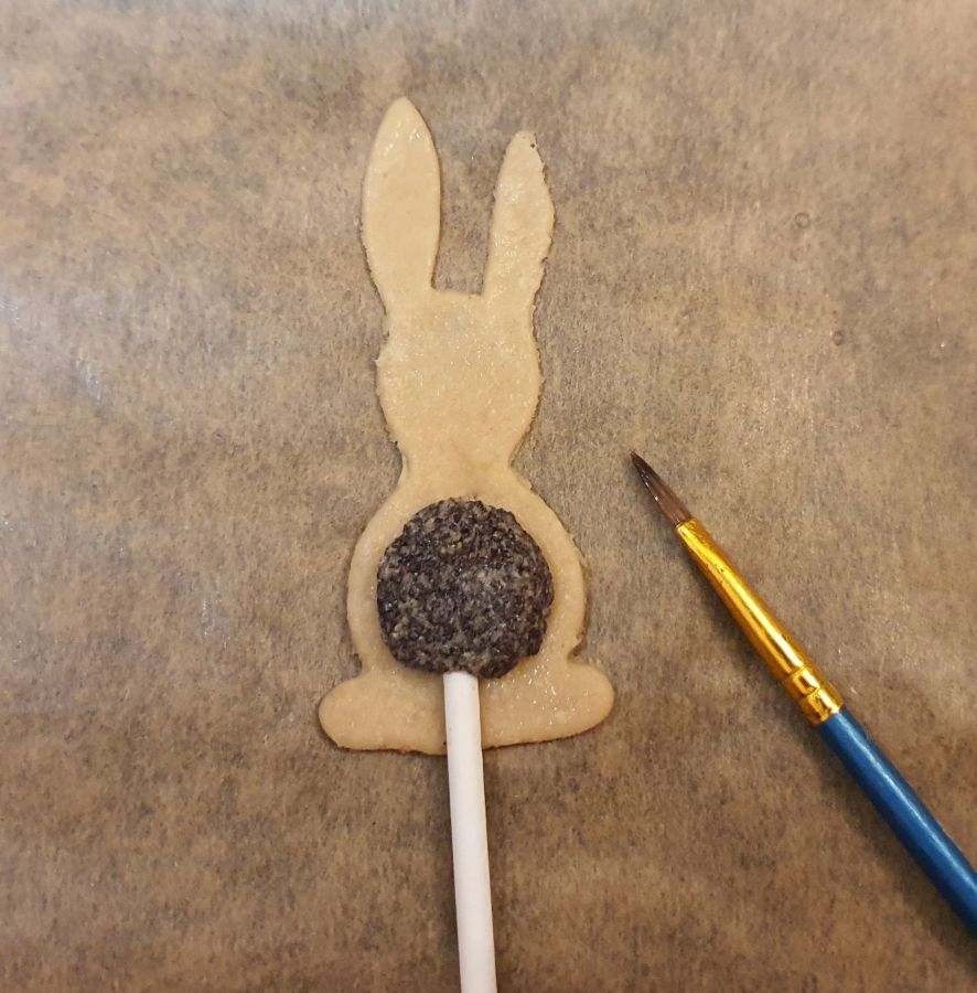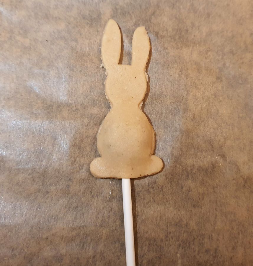 1 ausgestochenes Haserl auf ein Backpapier legen. Den Cakepop Stiel mittig drauflegen und etwas andrücken.