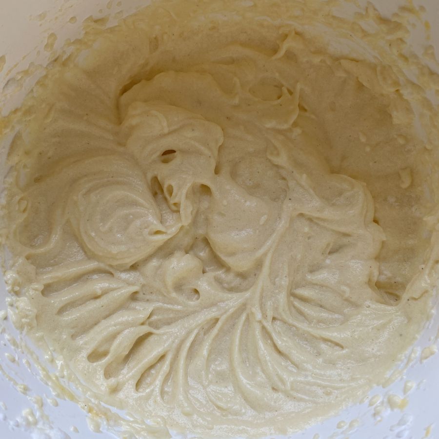 Ei zugeben und unter ständigem Rühren die Backmischung (Mandelbrioche oder Düsseldorfer Stutenbrot) zugeben und ca. 1 min weiterrühren.