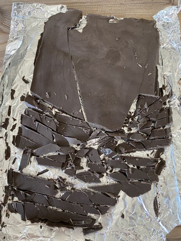 Die Schokoladenplatte mit einem Messer in kleine Stücke zerhacken und wieder im Kühlschrank kalt stellen.