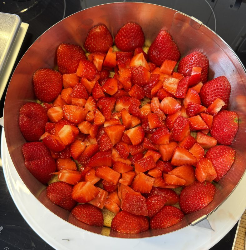 Einen Teil der Erdbeeren so schneiden dass sie mit der Schnittfläche nach außen an den Tortenring gestellt werden können. Um den Tortenring anordnen. Einen Teil der Erdbeeren für die Deko on Top aufheben (6 Stück).