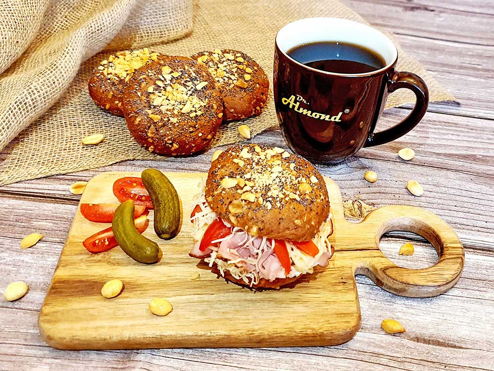 Teig in 8 Teile teilen und mit feuchten Händen Brötchen formen. Brötchen etwas flach drücken und mit gehackten Erdnüssen und Mohn bestreuen.