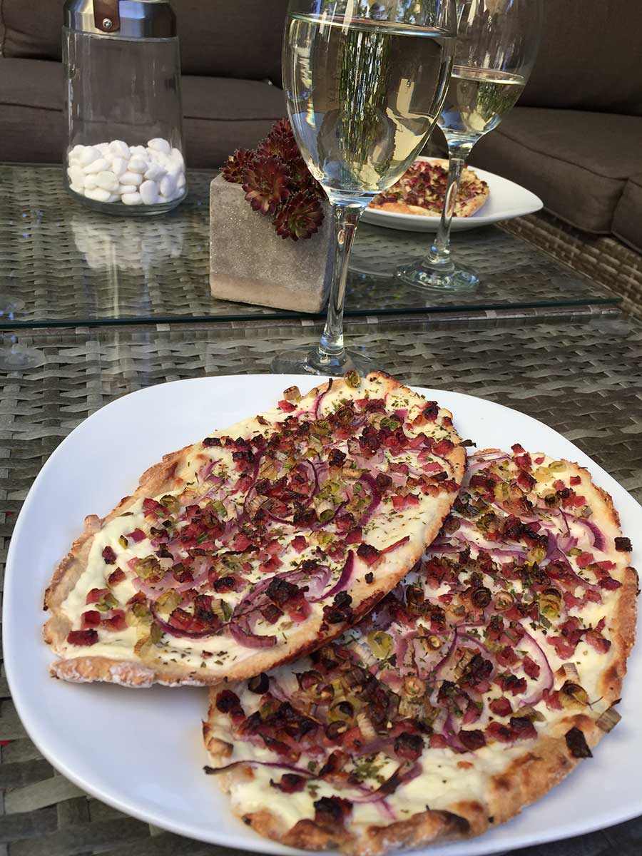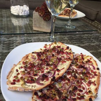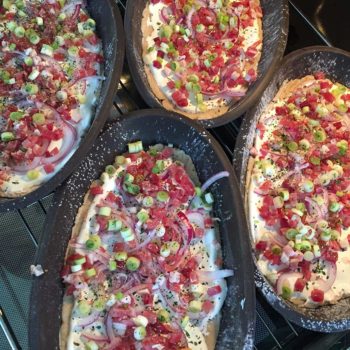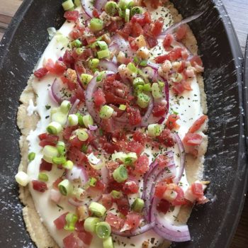 Den Boden mit Saurer Sahne bestreichen (vorher nach Belieben salzen). Zwiebeln, Schinkenwürfel und Frühlingszwiebeln darauf verteilen. Am Schluss mit "Bruchetta & Tomate" bestreuen!