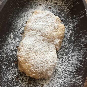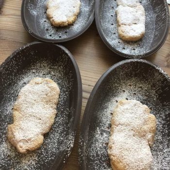 Mit feuchten Händen in vier Portionen teilen und zu ovalen Fladen formen - siehe Bild unten!