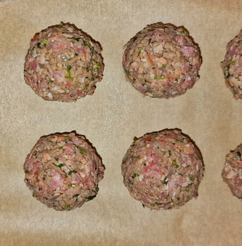 Die Fülle optional mit dem Senf vermischen und Bällchen formen. Hab die Fülle auf 6 Bällchen geteilt.