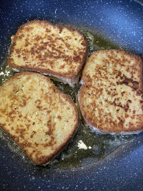 Butterschmalz (oder Butter) in einer Pfanne erhitzen. Erst einen Teil, dann bei den nächsten Scheiben wieder in Pfanne geben. Fett wird vom Toast aufgesaugt.