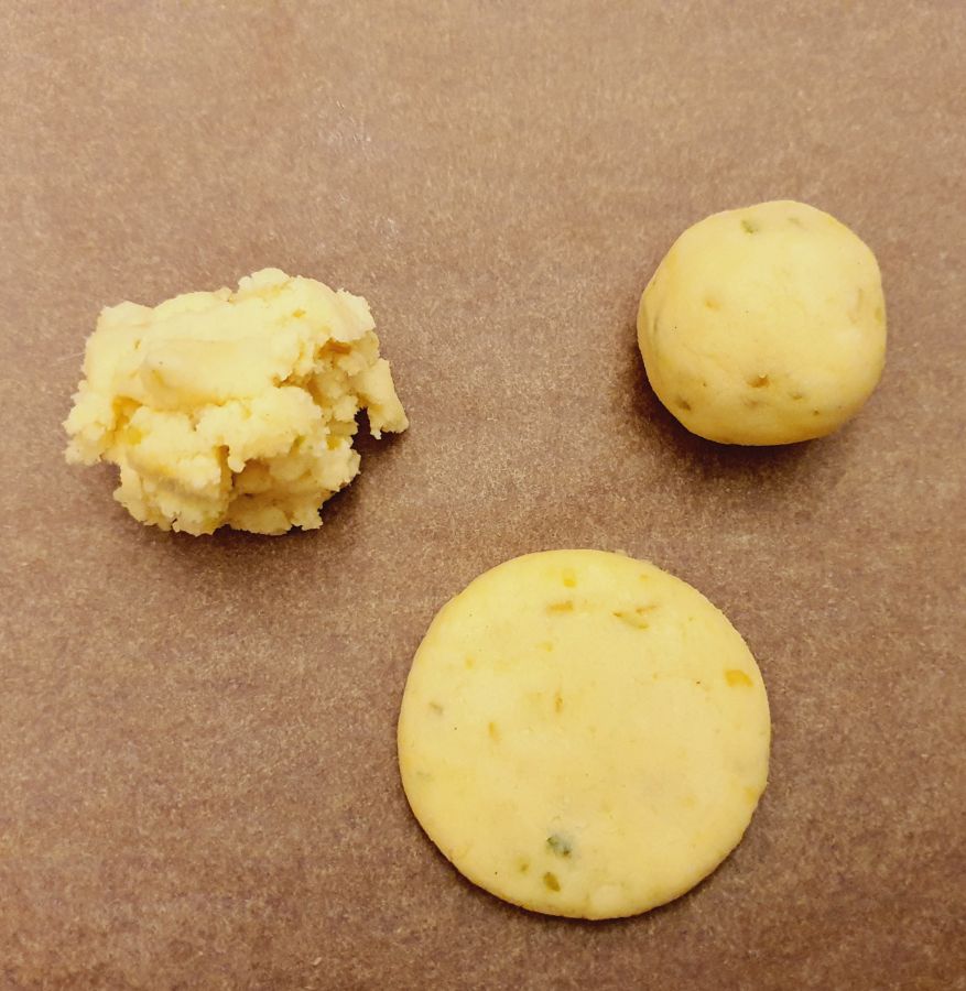 Dann Kugeln zu je 16g rollen und flach drücken.