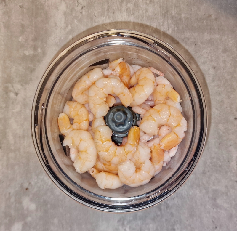 Die Garnelen in einem Multizerkleinerer fein zerkleinern und in eine Schüssel füllen.