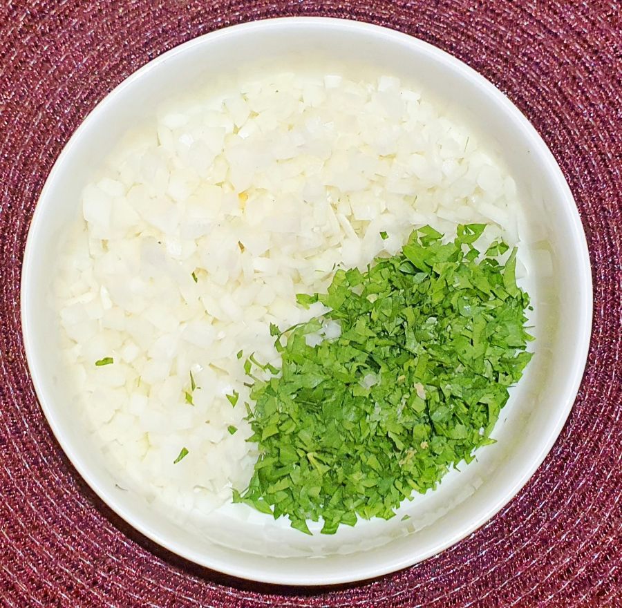 Pastareis nach Anleitung zubereiten (Variante 2 KLICK) Für die Fülle Zwiebel und Petersilie schneiden.