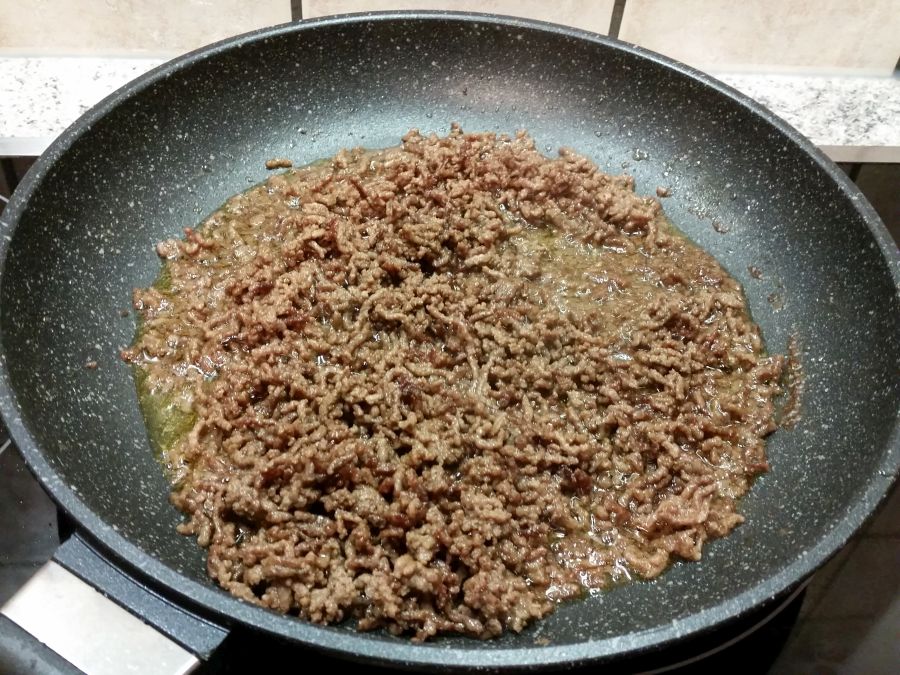 Das Hackfleisch mit der Zwiebel fein krümelig anbraten, nach Belieben würzen und etwas abkühlen lassen.