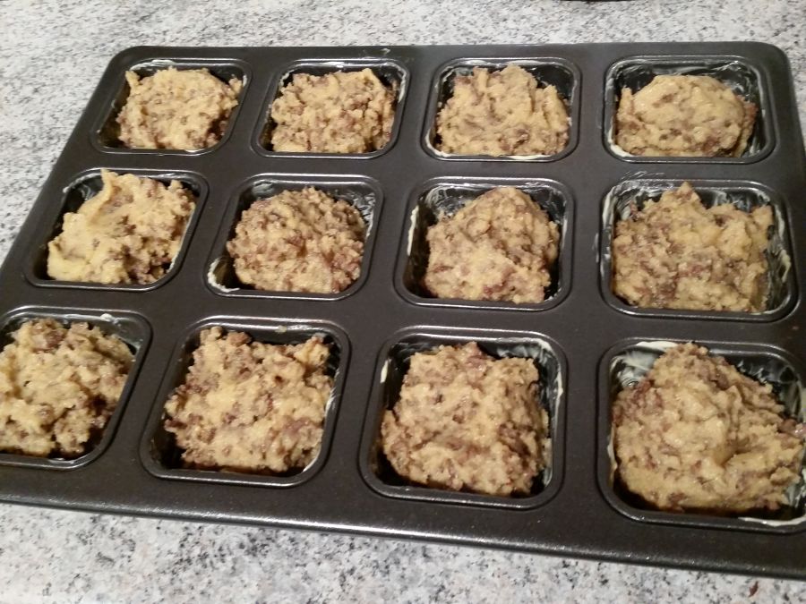 Den Kuchenzauber mit Salz, Gewürzen und Eiern verrühren, das Hackfleisch unterrühren (das Fett aus der Pfanne ebenfalls zugeben) und die Masse in Förmchen füllen.