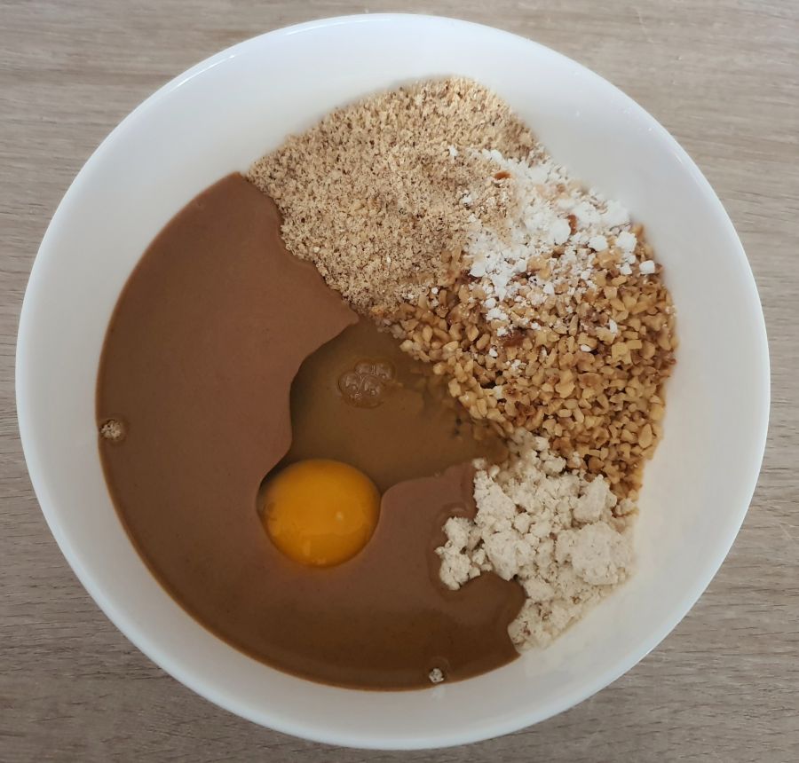 Für den Teig Haselnussfix, geröstet & gehackte Haselnüsse, Kuchenzauber, Low Carb Süße Puder, Vanillitraum, Ei, Nuketo und Pure Flavours zu einem Teig vermengen.