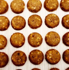Bei 170 Grad Umluft für 6 - 7 Minuten backen. Gleich aus der Form stürzen und mit der Seite nach oben auf ein Blech legen. So lange wiederholen bis der Teig verbraucht ist. Ich empfehle den Kauf von 2 Formen, dann gehts schneller. Danach bei 160 Grad für weitere 6 - 7 Minuten fertig backen. Und bei 70 Grad für mind. 1,5 h trocknen. Empfehle unbedingt die Kekse zu trocknen.