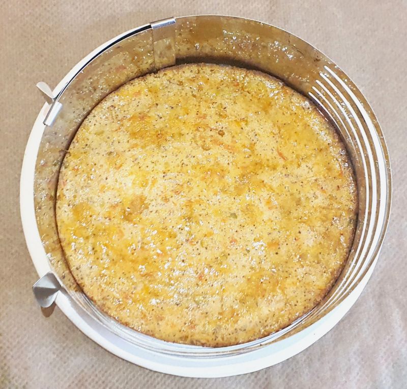 Nach dem Rasten des Teiges, die Karottenmischung mit einem Löffel unter den Teig rühren. Zuletzt die geschmolzene Butter zum Teig geben und verrühren.