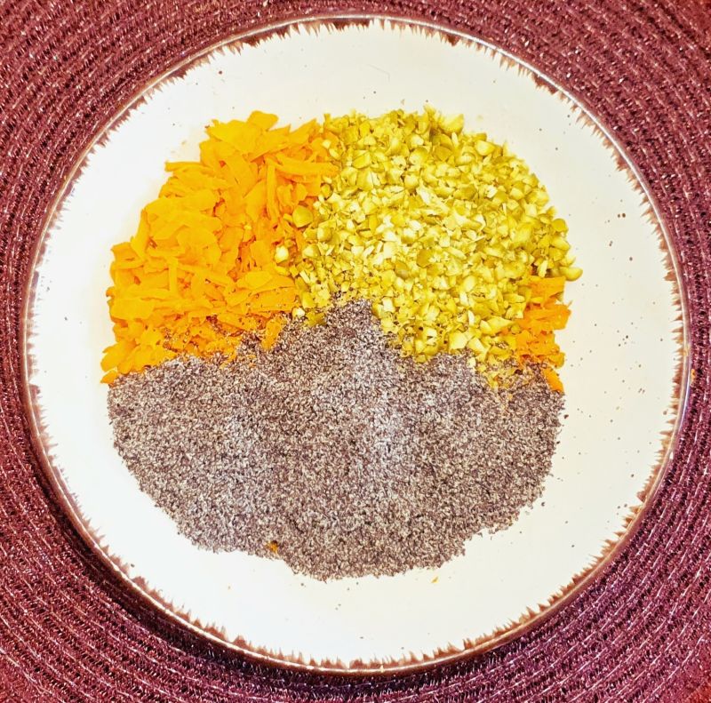 In der Zwischenzeit Karotten schälen und grob raspeln, Pistazien hacken - falls erforderlich, Mohnfix abwiegen und alle drei Zutaten miteinander vermengen.