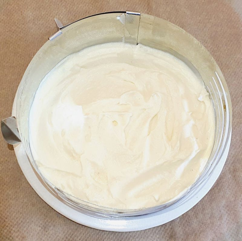 Eine Tortenring vorbereiten und den ersten Boden einlegen. Mit Marmelade bestreichen, etwas Creme verteilen und einen Boden draufsetzen. Den Boden wieder mit Marmelade bestreichen und mit der Creme wiederholen. Den letzten Boden aufsetzen und sollte noch etwas Creme über sein, oben drauf streichen. Mit Frischhaltefolie abdecken und über Nacht in den Kühlschrank stellen.