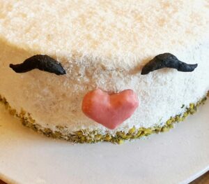 Die Ohren, Pfoten etc. aus dem Kühlschrank holen. Bei den Ohren am unteren Rand je 3 Zahnstocher vorsichtig etwas reindrehen. Dasselbe bei den Augen und dem Nasenherz. Die Nase mittig auf der Torte aufsetzen, und dann die Augen.