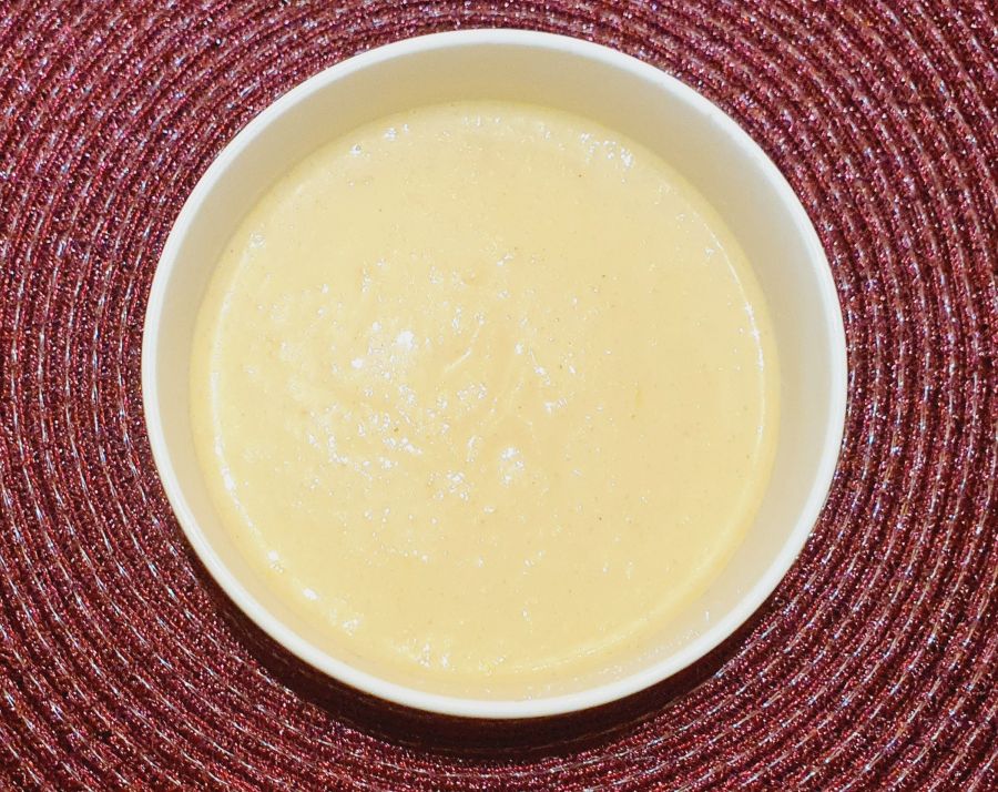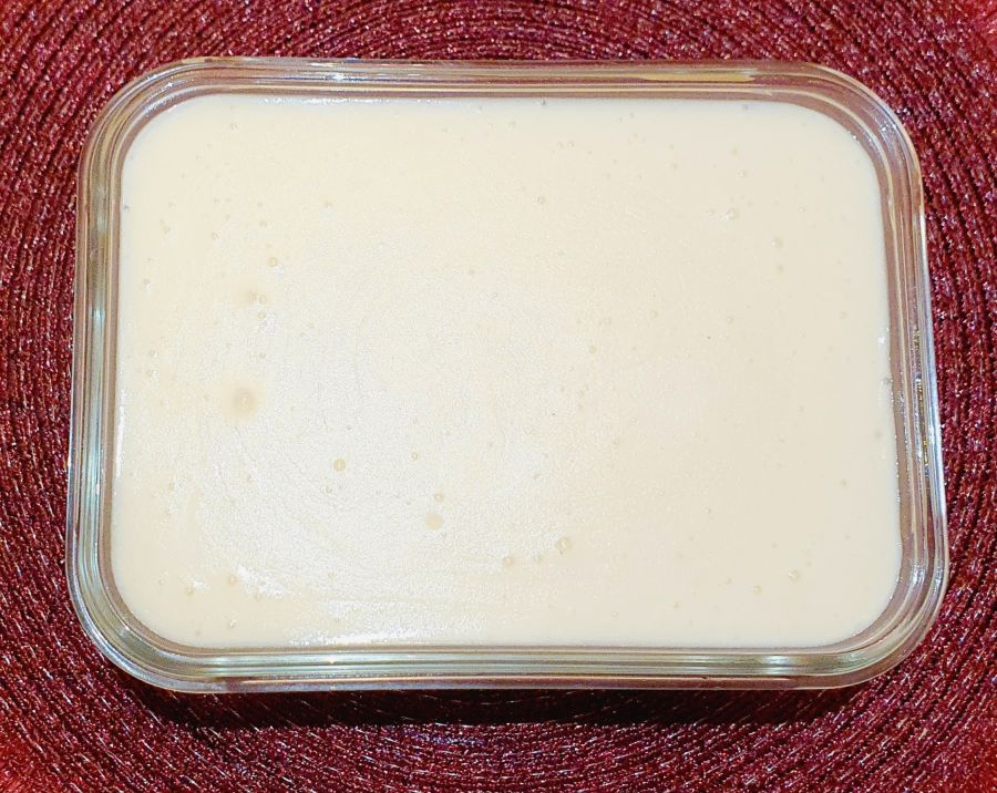 Für die letzte Schicht, Milch, Sahnepudding, Zitrusfaser und Pure Flavour mit einem Stabmixer vermischen und für 1 - 2 Minute bei 900 Watt in der Mikrowelle erwärmen. Etwas abkühlen lassen und als letzte Schicht in die Glasbowl leeren.