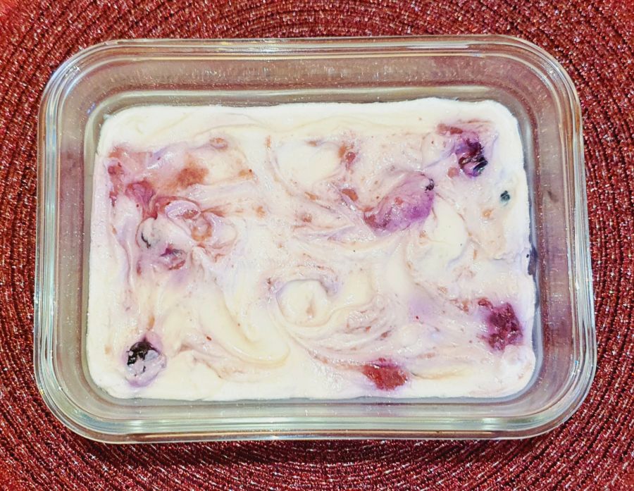 Die weiße Joghurtcreme draufschichten und etwas von der Heidelbeercreme mit einem Löffel unter die Masse ziehen.