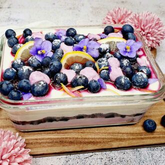 Die restliche Heidelbeerecreme für die Deko auf die Puddingschicht gießen, diese vorher nochmal kurz in der Mikro erwärmen. Dann mit Zitronenscheiben und den restlichen Blaubeeren dekorieren. Mit Vanilletraum bestreuen.
