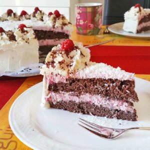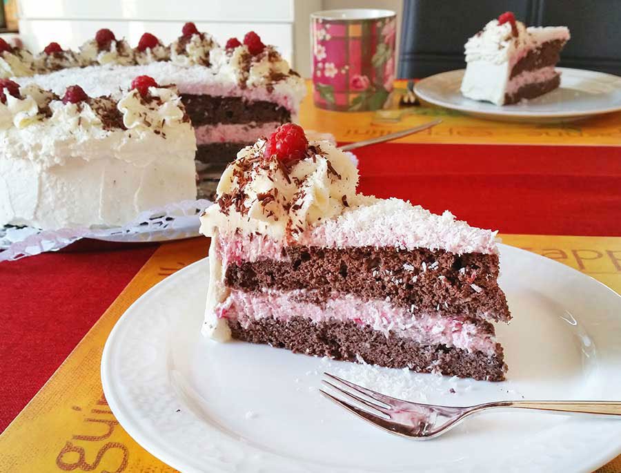 Die Sahne für die Füllung steif schlagen. Die Gelatine mit 6 EL kaltem Wasser aufweichen. Den Quark mit der Schlagsahne, Süße, Vanille und Zitronenschale glatt rühren. Die aufgeweichte Gelatine zuerst mit 2 EL der Quarkmasse verrühren und anschließend komplett in die Quarkmasse einrühren. Himbeeren und Kokosraspeln unterheben.