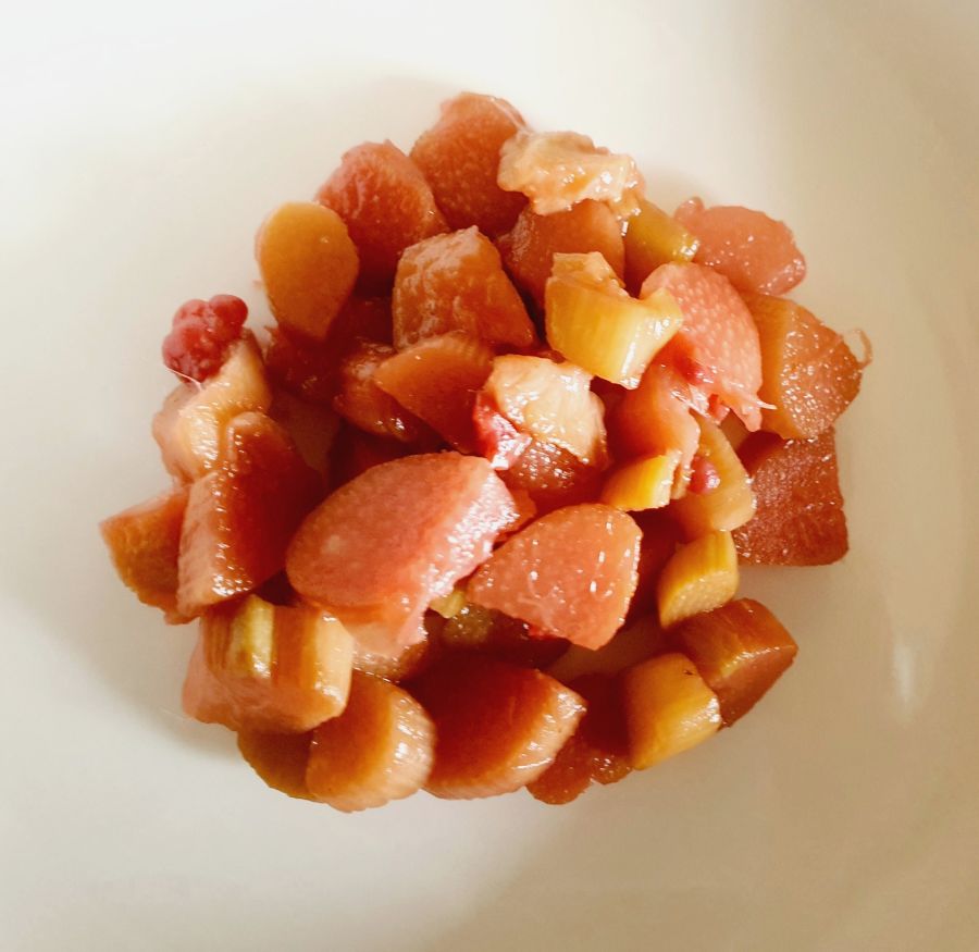 Jetzt die Pfanne mit dem restlichen Rhabarber erhitzen und den Rhabarber weich dünsten bis die Flüssigkeit weg ist. Das geht rasch, der Rhabarber soll aber nicht verkochen.