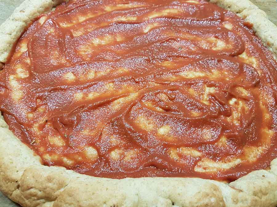 Die passierten Tomaten (oder Tomatensauce) nach Geschmack salzen und würzen und gründlich mit der Zitrusfaser verrühren. Die Sauce gibt dadurch weniger Wasser an den Teig ab und der Teig wird knuspriger. Den Teig mit der Sauce bestreichen und mit Gouda oder Cheddar bestreuen.