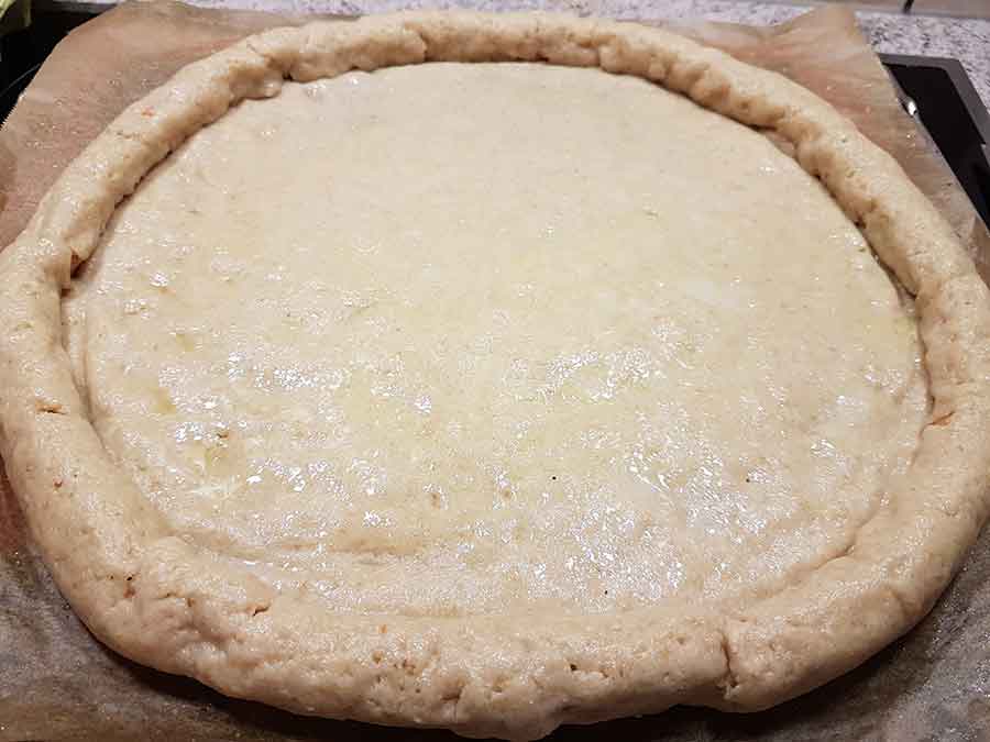 Den Pizzateig ca. auf Backpapier-Größe ausrollen (Backpapier vorher gut mit Olivenöl einfetten!). Die Würstchen ca. 3 cm vom Rand entfernt platzieren und von außen mit überstehendem Teig umwickeln. Den Teig auf der Innenseite gut festdrücken und zum Schluss mit dem restlichen Olivenöl bestreichen. Bei 190 °C ca. 15 min mit Umluft oder 20 min mit Ober- und Unterhitze vorbacken. Anschließend den Teig kurz vom Backpapier lösen und aufsetzen (dadurch klebt er nach dem zweiten Backen nicht mehr an).